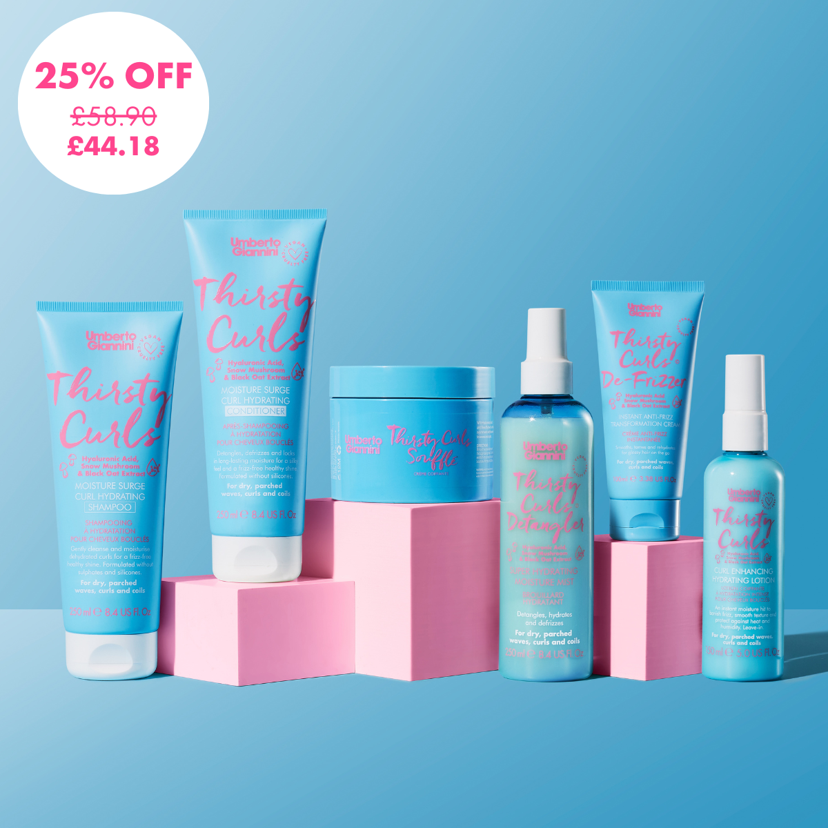 Thirsty Curls Detangler: Water (Aqua), Amodimethicone, Polysorbate 20, PEG-12 Dimethicone, Sodium Benzoate, Fragrance (Parfum), Cetrimonium Chloride, Trideceth-12, Polyquaternium-22, Citric Acid, Potassium Sorbate, Polyquaternium-11, Trisodium Ethylenediamine Disuccinate, Tremella Fuciformis (Mushroom) Extract, Glycerin, Phenoxyethanol, Pentylene Glycol, Avena Strigosa Seed Extract, Fructose, Sodium Hydroxide, Urea, Lecithin, Ethylhexylglycerin, Lactobacillus Ferment, Allantoin, Maltose, Sodium Chloride, Sodium Lactate, Sodium PCA, Trehalose, Glucose, Sodium Hyaluronate, Limonene, Alpha-Isomethyl Ionone, Linalool.