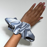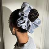 This XXL Grey Pillow Scrunchie is an ideal alternative to traditional elastics. Cocoons hair in a vegan silk cushion, helping to prevent snagging and pulling.